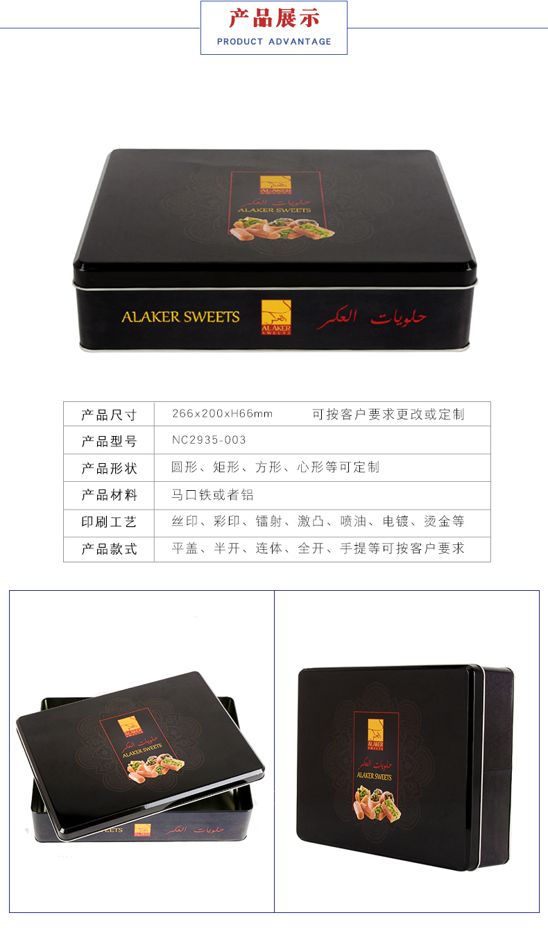 - 款号:NC3259-001 尺寸:239x239xH353含外卷线 材质:一级马口铁/磨砂铁/铝/基板铁/镀锌板,厚度0.23mm-0.30mm 印刷:四色印刷+专色印刷 表面可做金油、光油、哑油、过光印哑、爆炸油、皱纹油、珠光油等工艺选择 雕刻:平面雕刻、3D雕刻 简介:广州博新专注制作马口铁食品包装铁罐,马口铁金属包装产品,立即下单,可免费获得博新制罐提供的一站式包装铁罐解决方案,定制热销400-800-2328! 用途:饼干铁盒包装定制