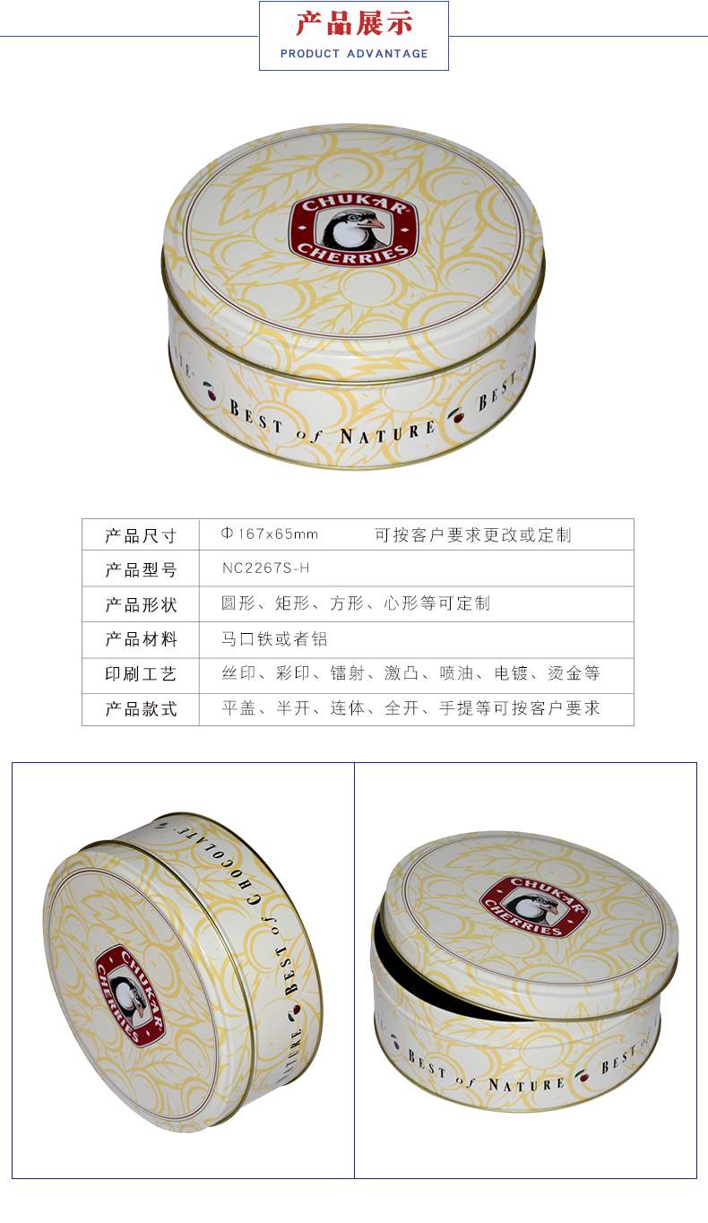 - 型号:NC3041 尺寸:dia80×30-h-mm 材质:马口铁 用途:糖果圆形铁盒